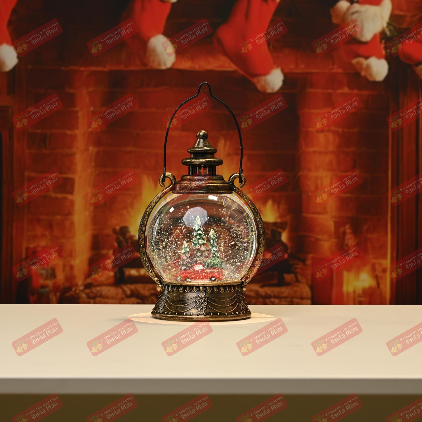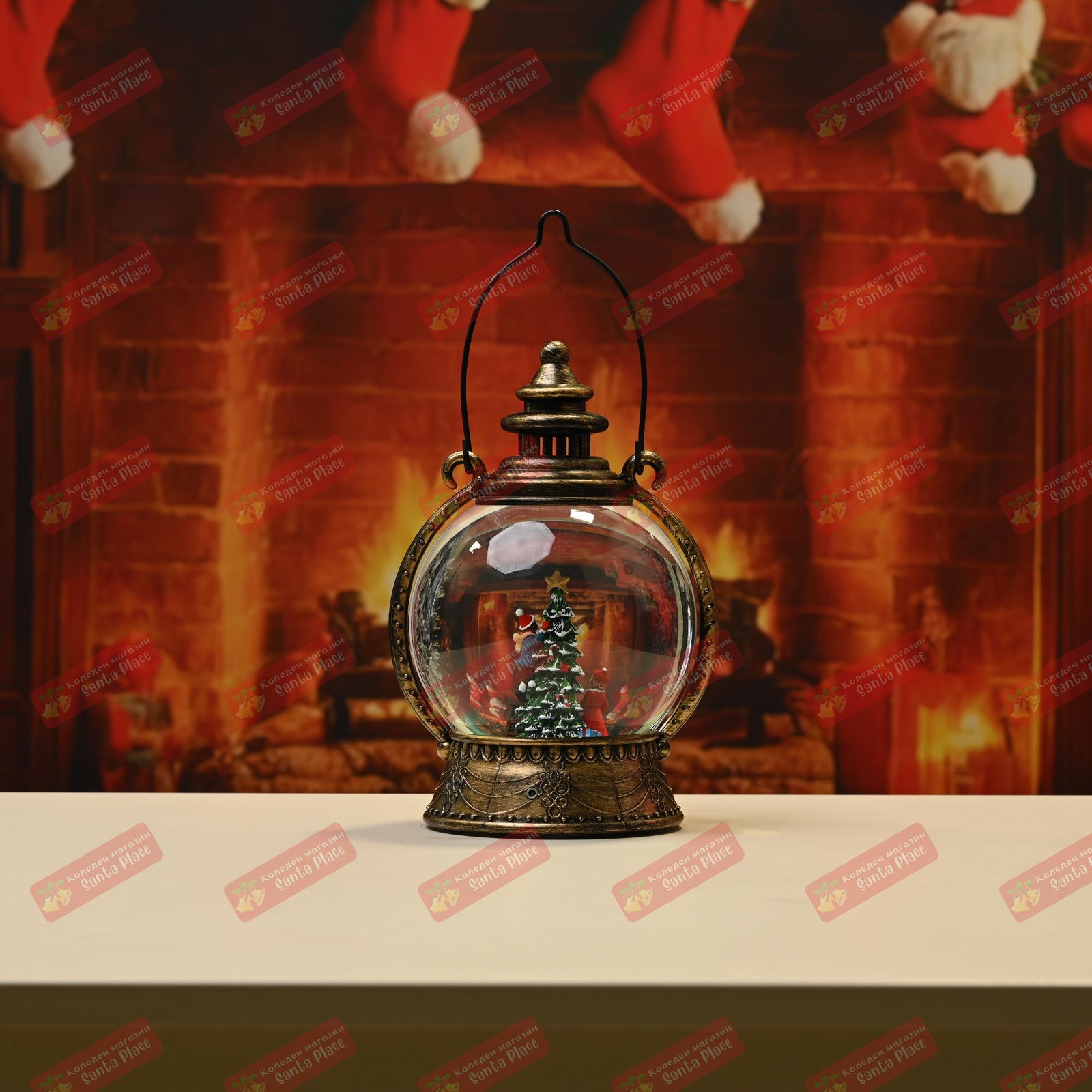 Μέσα στη διαφανή σφαίρα, ένας μικρός χριστουγεννιάτικος κόσμος ζωντανεύει – φωτίζεται απαλά, πασπαλισμένος με νιφάδες χιονιού που περιστρέφονται ομαλά, δημιουργώντας ένα μοναδικό εφέ.